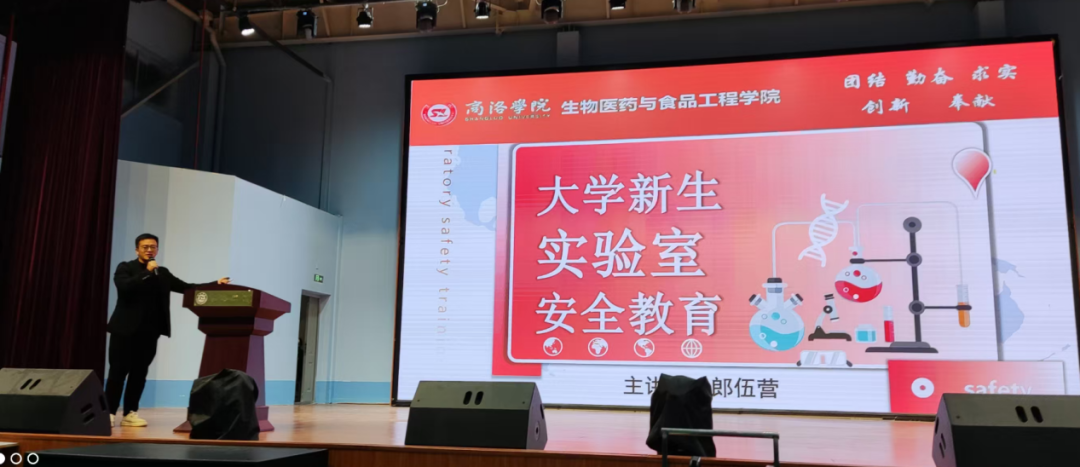 学院实验中心主任郎伍营博士为新生上“实验室安全教育”大课,引导新生树牢安全意识,认真学习、严格遵守实验室安全管理制度。