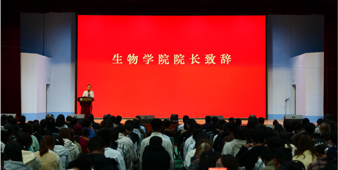 院长赵永平致辞,代表全院对2025级新同学表示热烈欢迎。他从学院发展历程、学科优势、科研平台及人才培养成果等方面进行介绍,并以“探索生命科学奥秘”为主题寄语新生:“希望同学们永葆对生命科学的好奇心,既专注基础研究,也勇于跨界融合,在微观世界中发现宏观价值,成为兼具创新精神与社会责任的生物学子。”